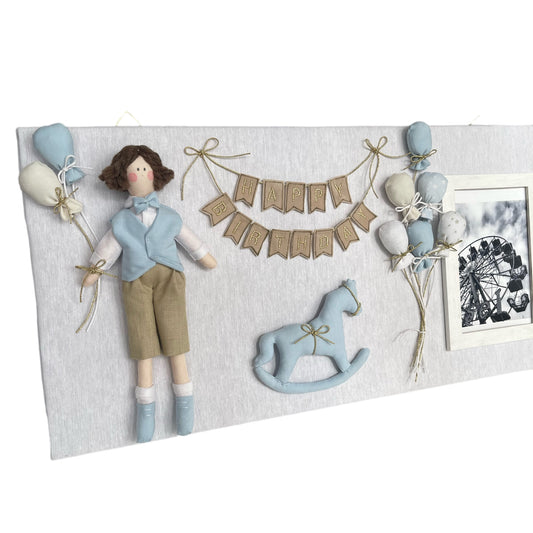 Quadro porta foto "Happy Birthday" rivestito in tessuto con bambola