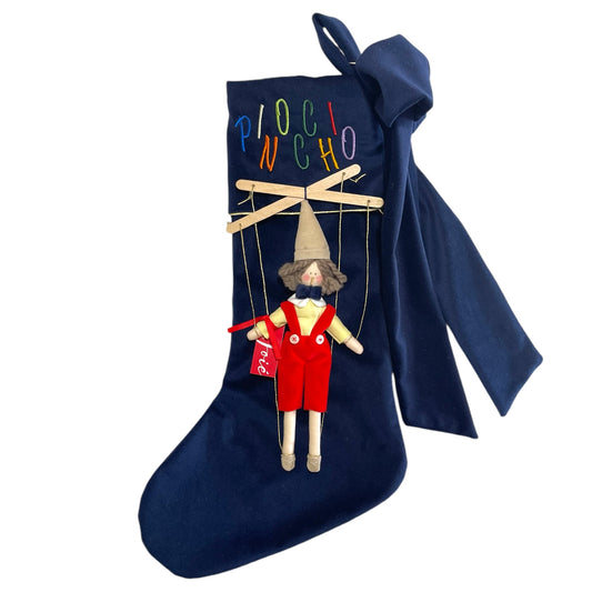 Calza epifania in velluto con bambola Pinocchio marionetta