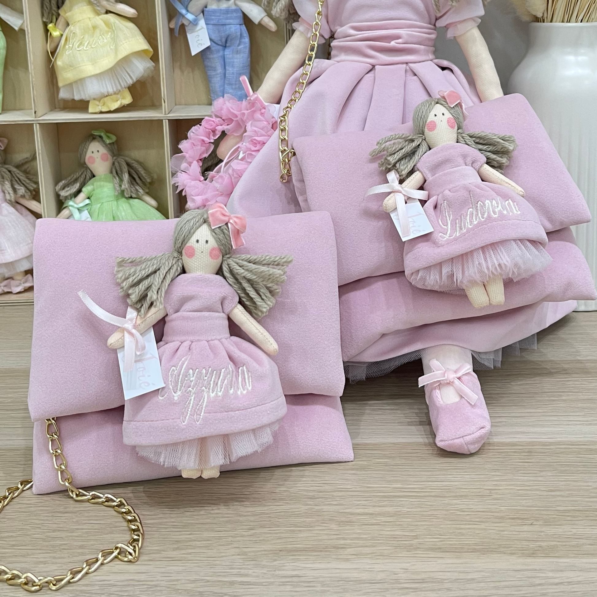 Borsa a tracolla in velluto con bambola MiniMe.