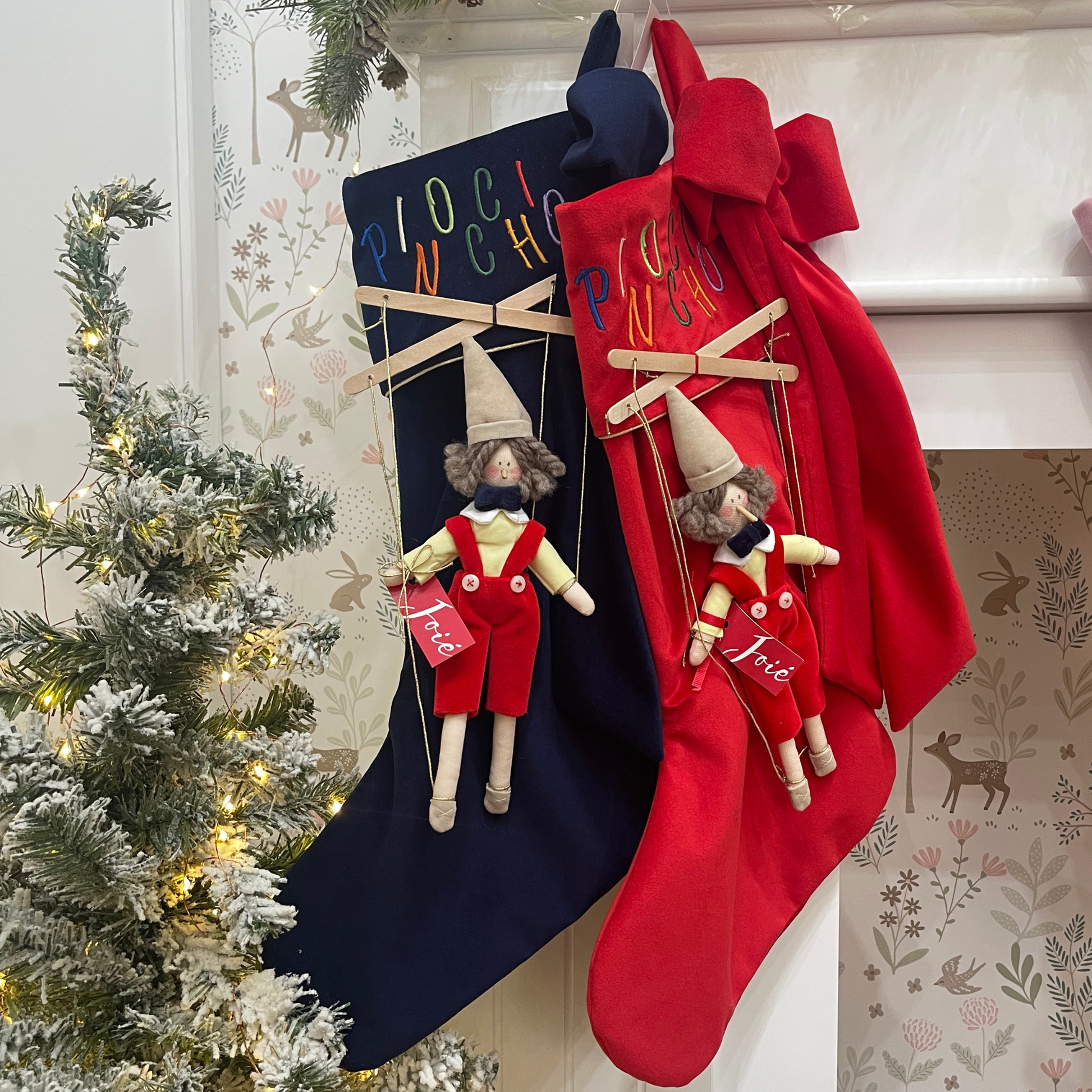 Calza epifania in velluto con bambola Pinocchio e fiocco laterale
