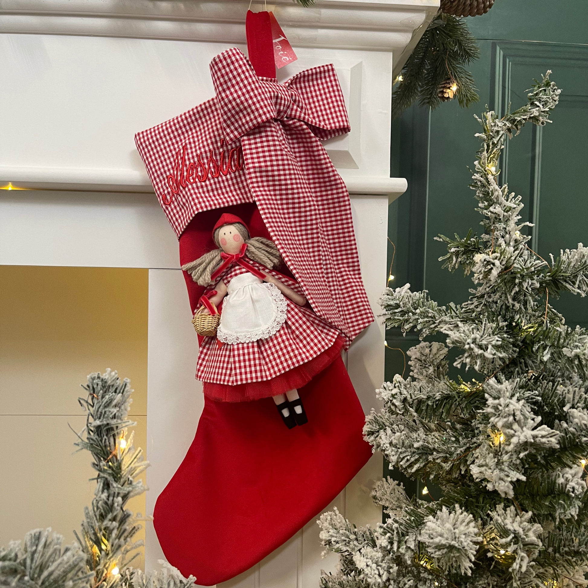 Calza epifania in velluto con bambola Cappuccetto Rosso, con risvolto in cotone a quadrettino e fiocco laterale