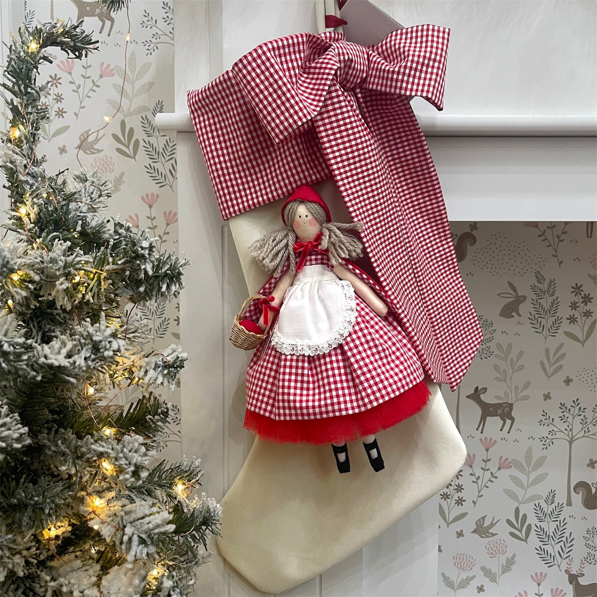 Calza epifania in velluto con bambola Cappuccetto Rosso, con risvolto in cotone a quadrettino e fiocco laterale