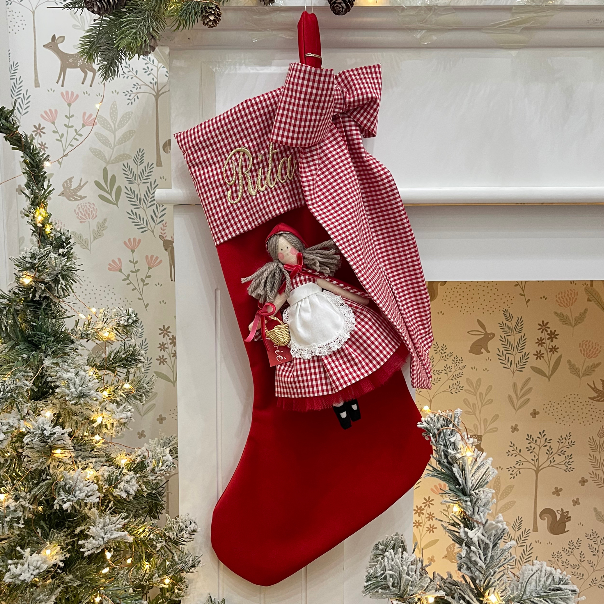 Calza epifania in velluto con bambola Cappuccetto Rosso, con risvolto in cotone a quadrettino e fiocco laterale