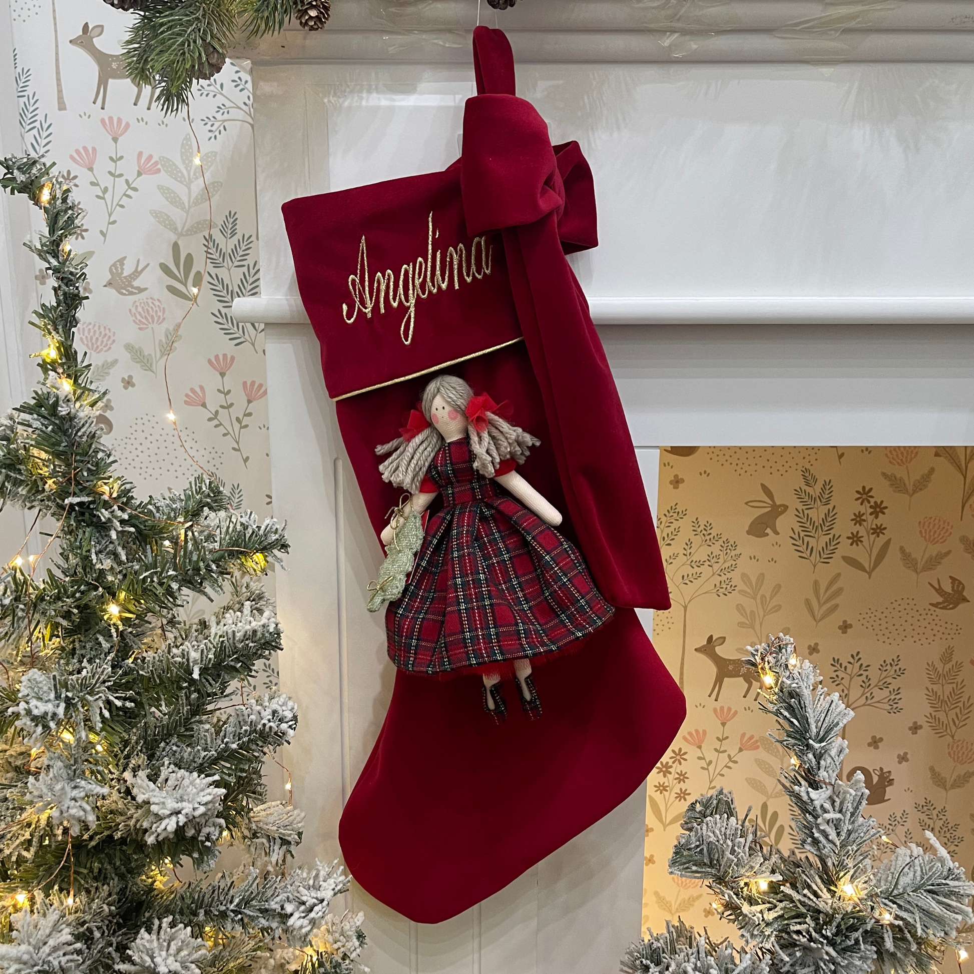 Calza epifania in velluto bordeaux con bambola Lilibet in tartan 21cm