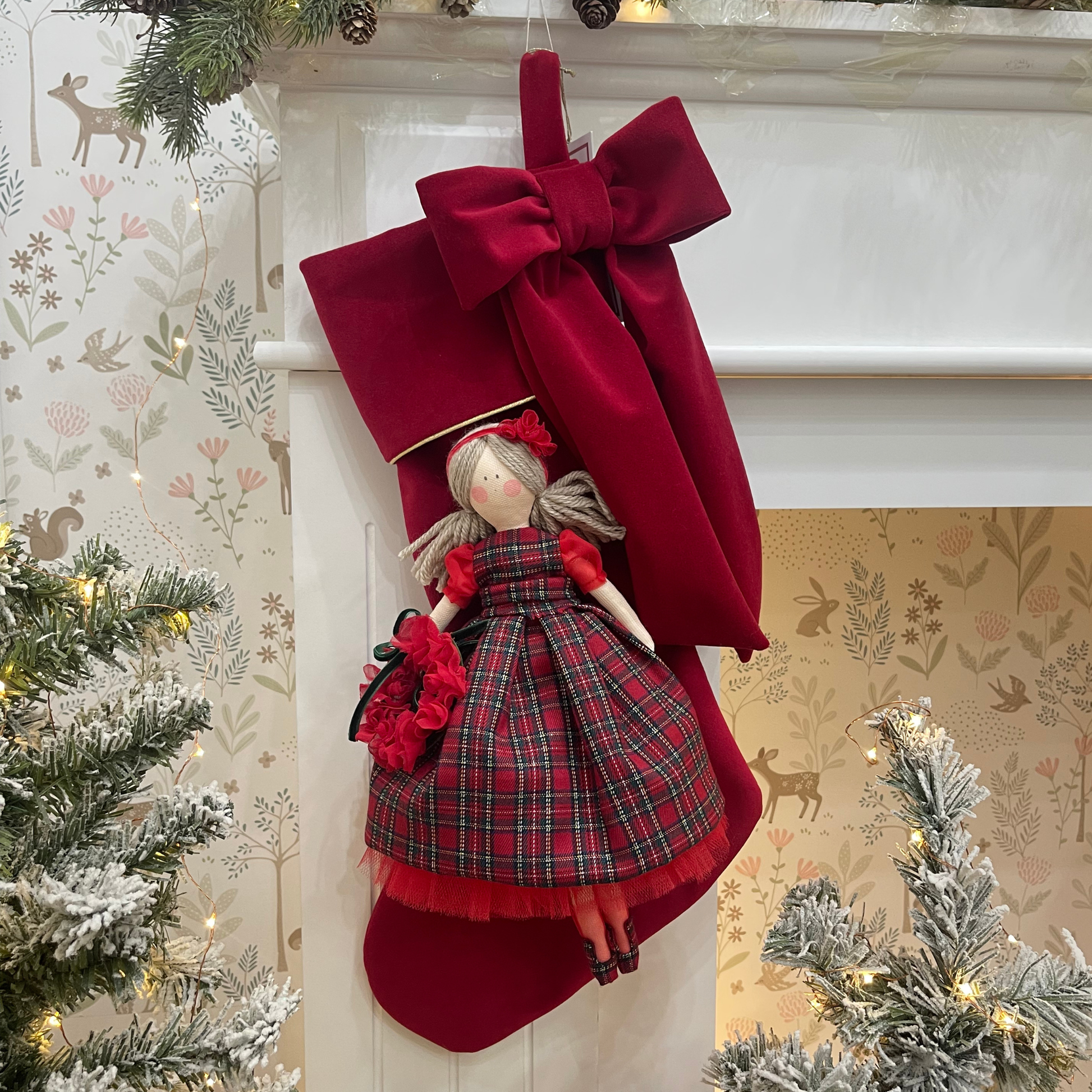 Calza epifania in velluto bordeaux con bambola Lilibet in tartan 30cm