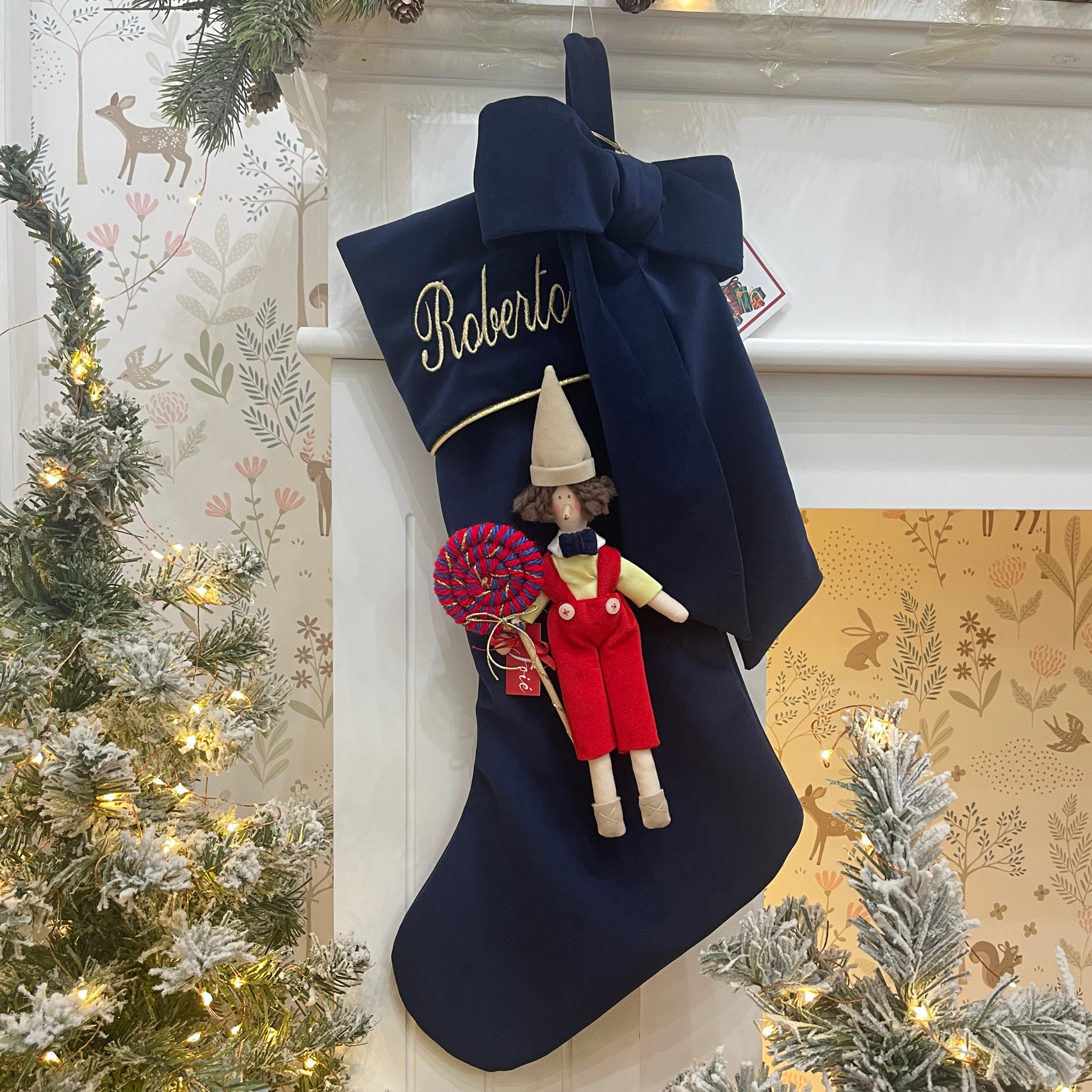 Calza epifania in velluto con bambola Pinocchio e fiocco laterale