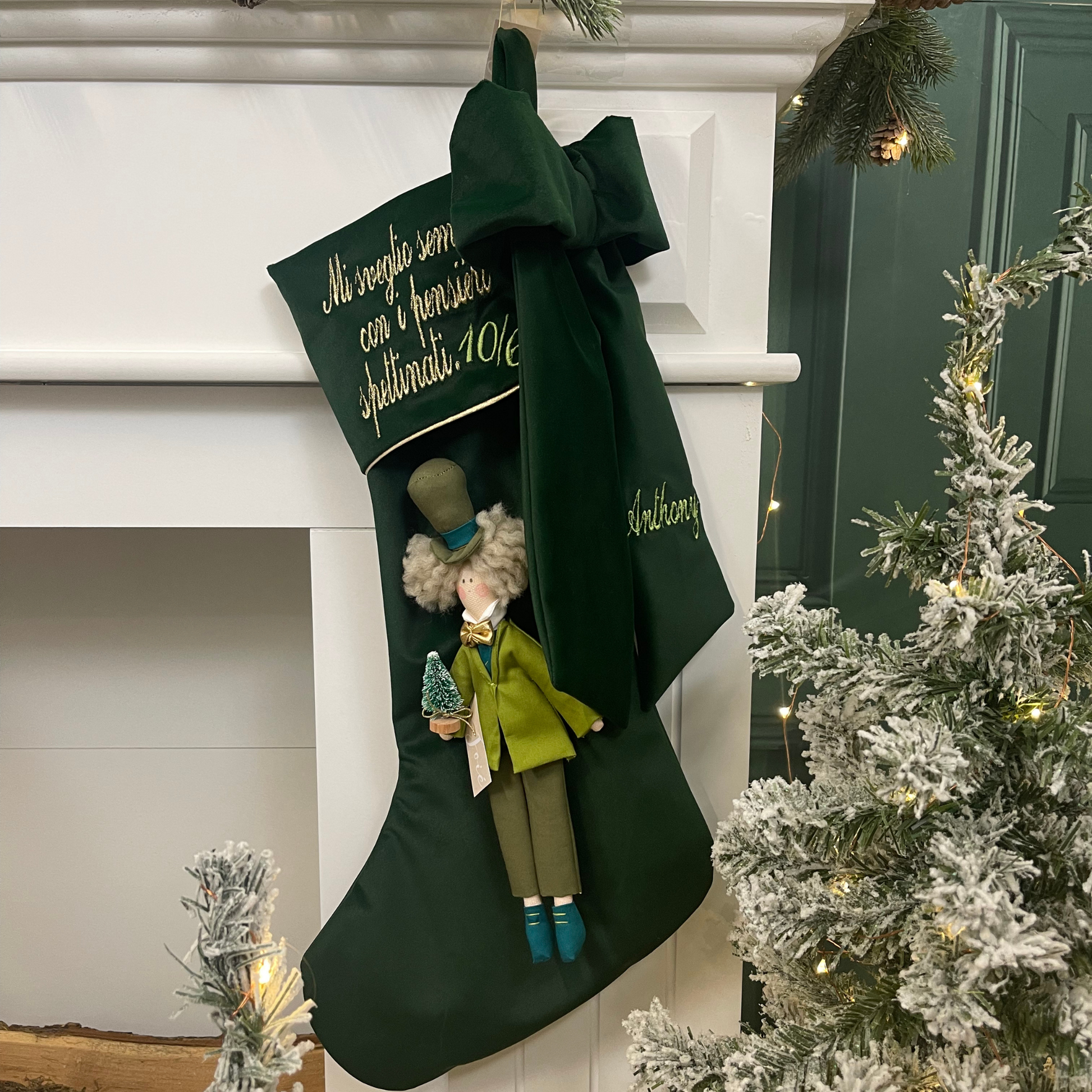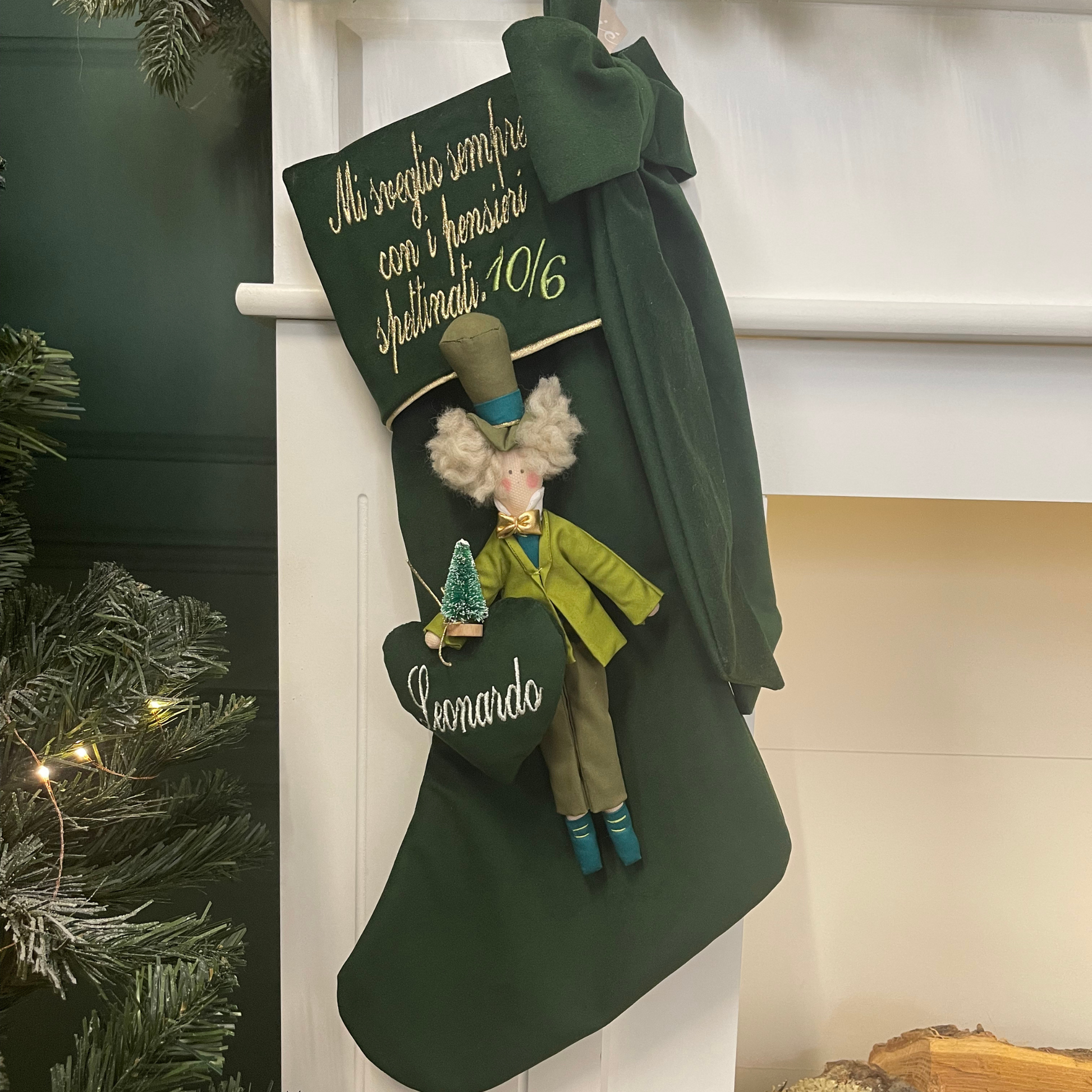Calza epifania in velluto con bambola Cappellaio Matto e fiocco laterale